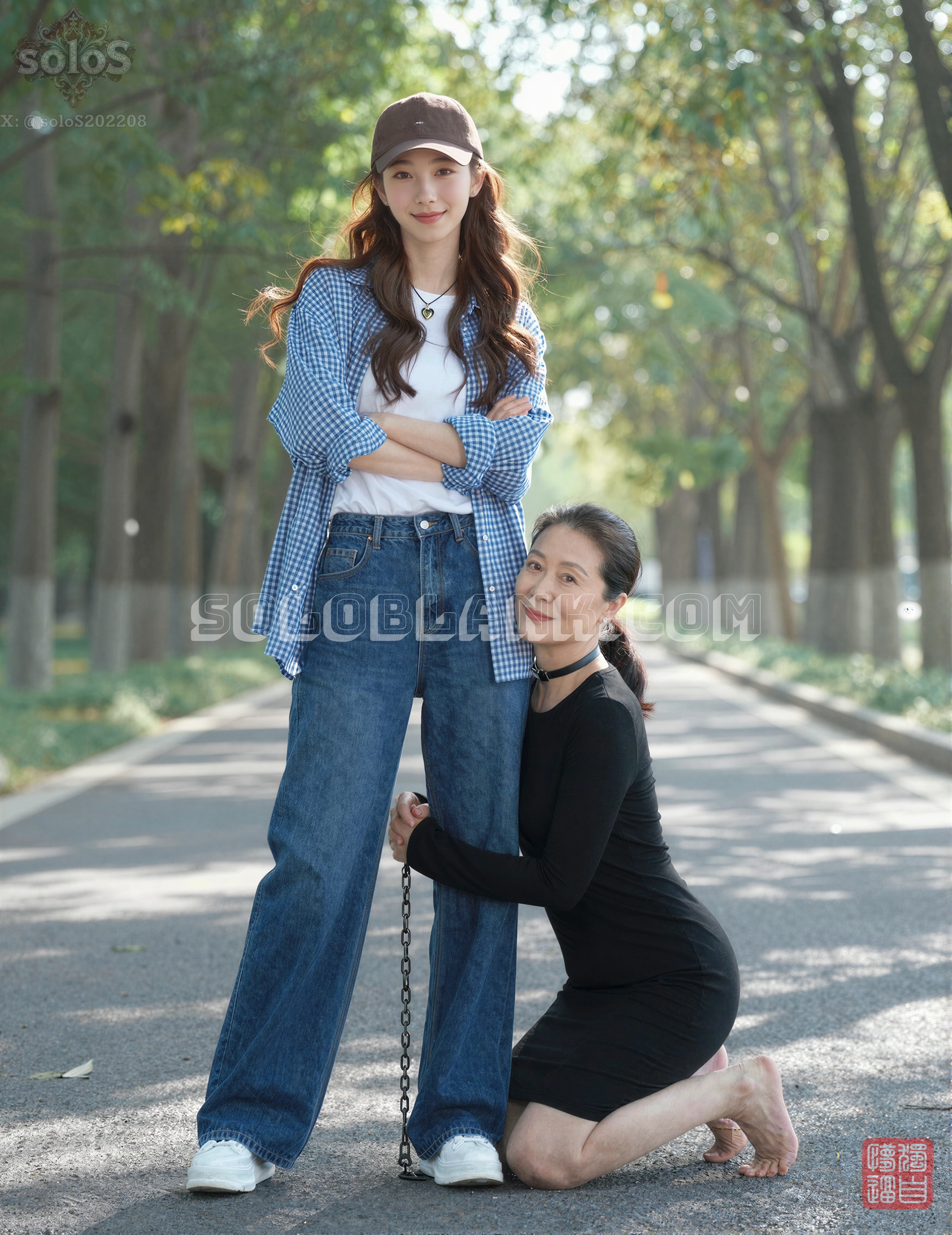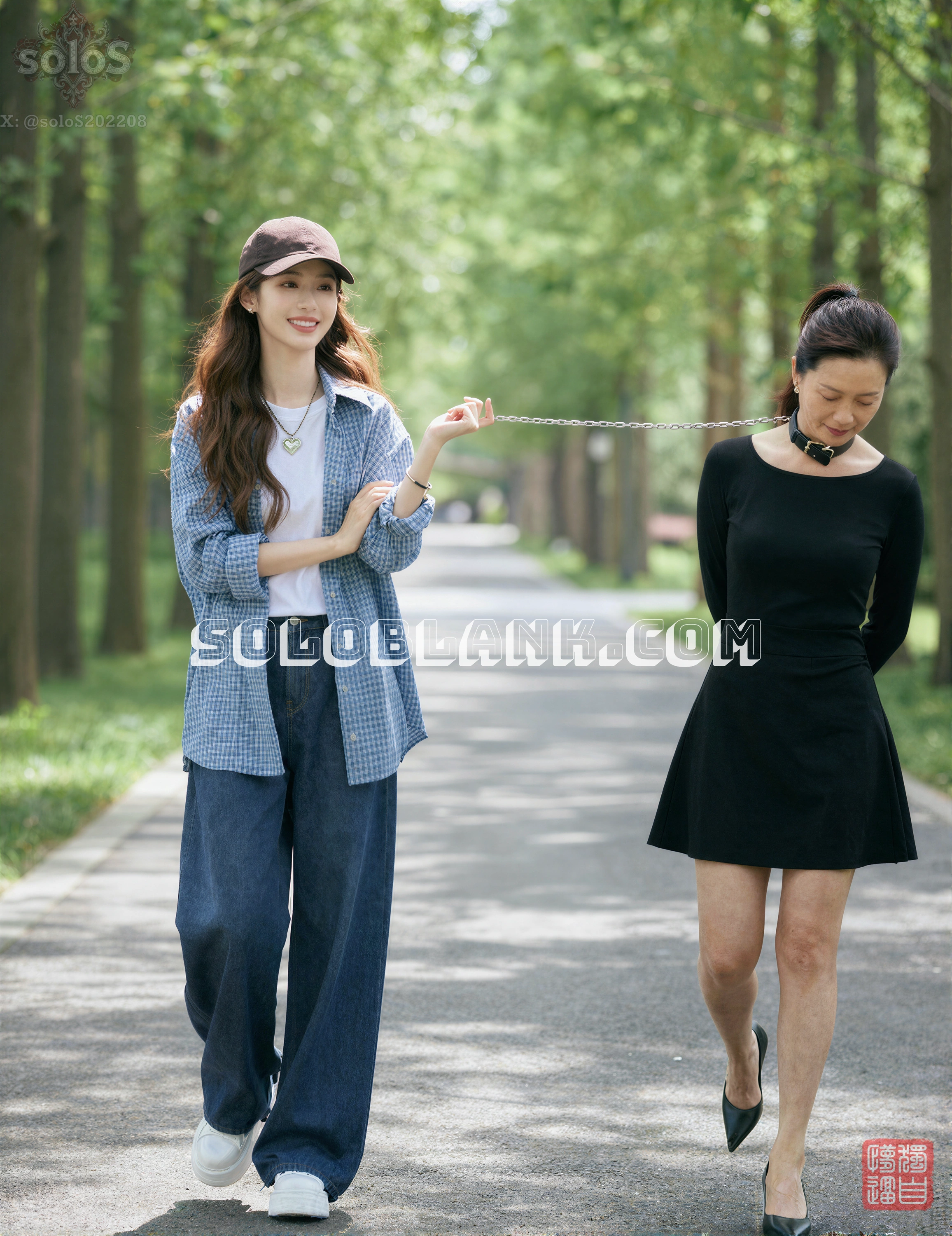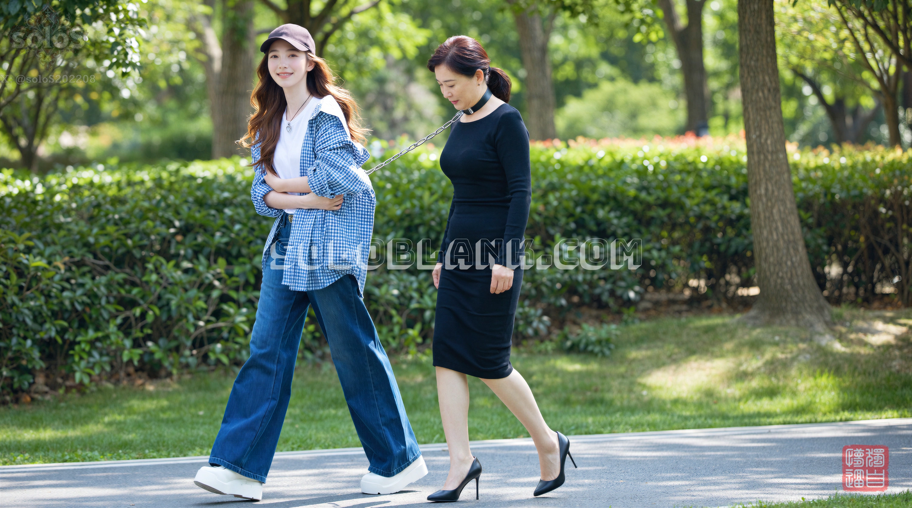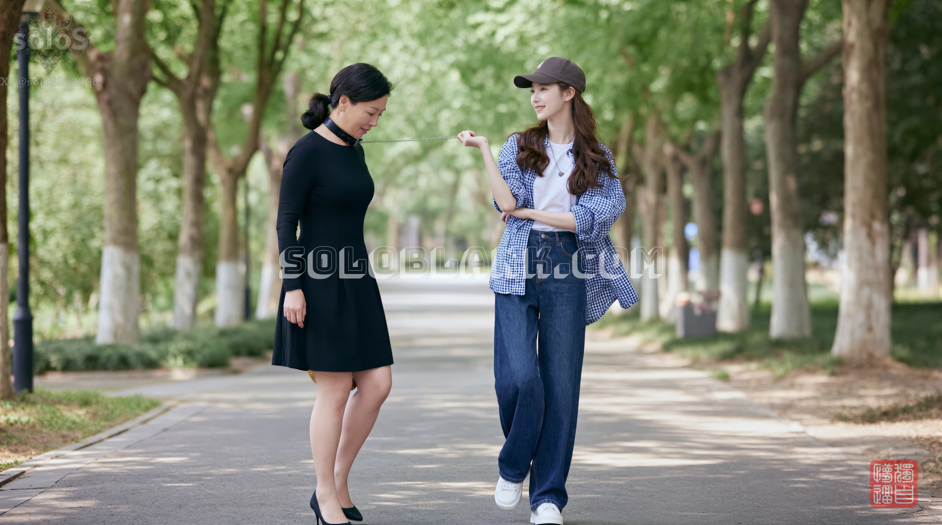 The moment the collar clicked shut, Shu Hua’s breathing shattered. Initial panic swept over her like a storm. She kept her head lowered, legs slightly bent. The black dress looked glaringly inappropriate in the sunlight, and one stiletto heel had already sunk into the mud, making it hard for her to move quickly. Her inner conflict reached a boiling point: Oh my God… it’s really on… In a public park, being leashed by a twenty-year-old girl… What if those students come back? My dress is so short, my posture so degrading… This isn’t a game. This is self-destruction! How could I let myself fall this low?